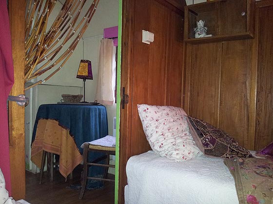 La roulotte foraine des années 30, climatisée et aménagée pour 2 personnes (grand lit ou 2 lits single), est située à l’extrémité du terrain de pétanque, au calme.